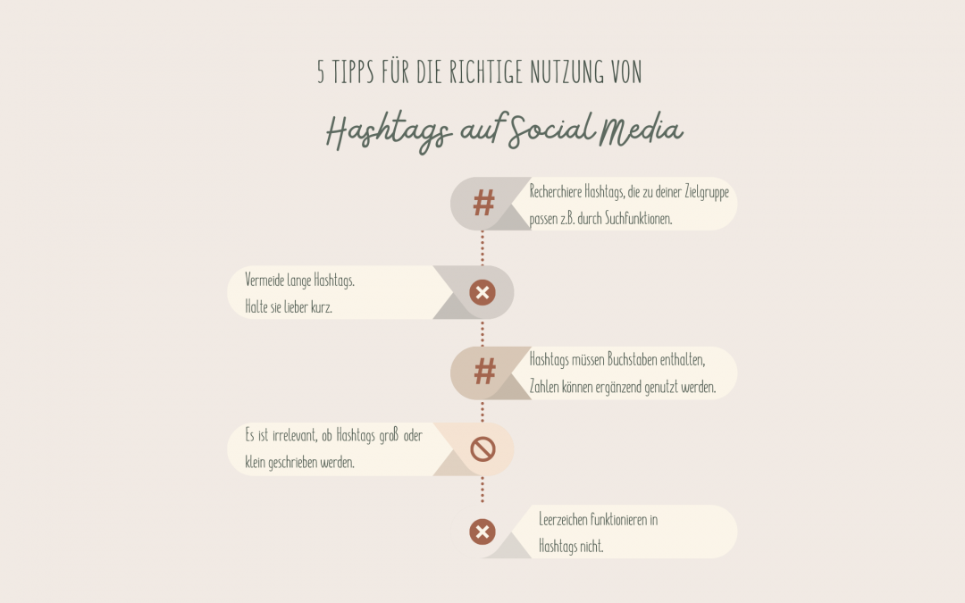 Hashtags sollten kurz, prägnant und leicht lesbar sein. Vermeide zu lange Hashtags, da sie schwer zu merken sind und Platz in deinem Beitrag einnehmen. Achte auch auf die Schreibweise und Vermeide komplexe oder schwer verständliche Hashtags, die die Lesbarkeit beeinträchtigen könnten. - Marken- und Kampagnen-Hashtags: